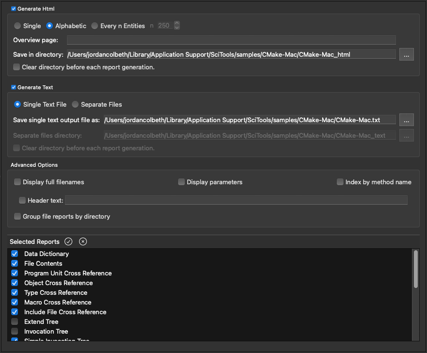 In the report configuration screen, you can specify whether to generate html versions, txt versions, or both. You can also specify your output filepath, as well as a handful of advanced options like adding custom headers, displaying parameters, or grouping reports by directory. Most importantly, here is where you will select the reports you'd like to run: