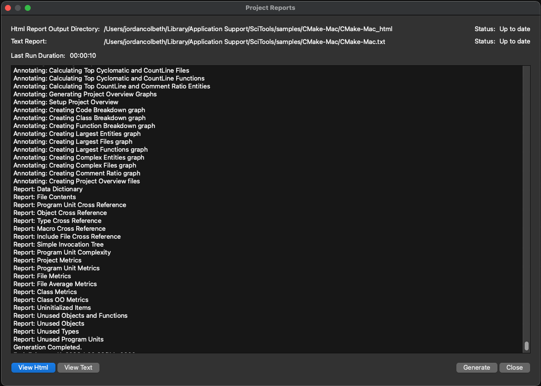 Once your reports are selected, just press OK in the bottom right and the window will close. Now, we have to generate our reports! To do so, go back to the top level menu and select Reports -> Generate Reports. Once the reports are finished being created, you'll be able to view them, regenerate them, or simply close the window: