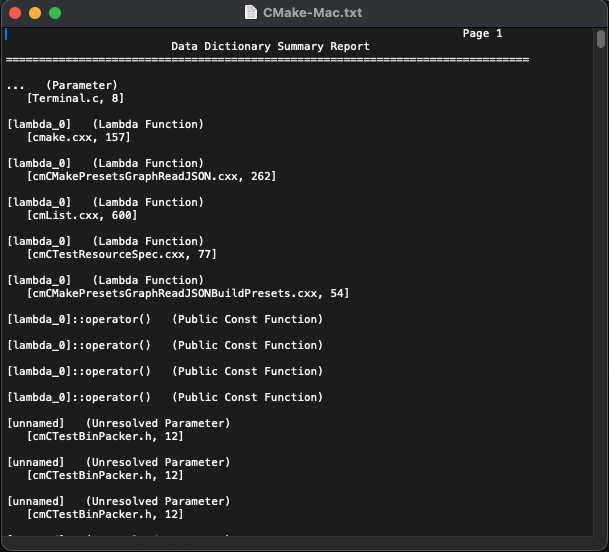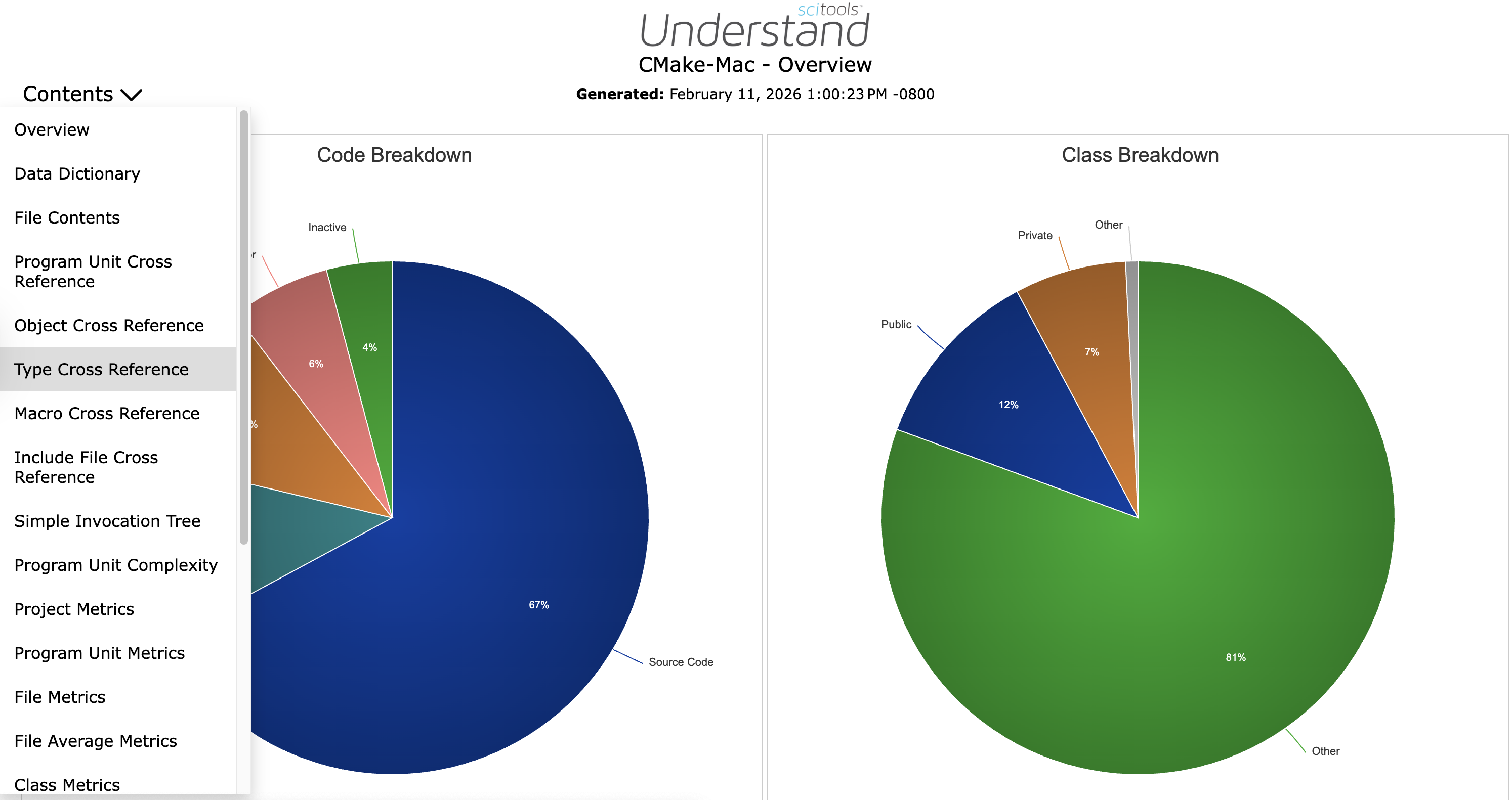 With the html version, there is a full table of contents with each individual report, as well as a project overview with a handful of helpful graphics and charts. If we click into one of the reports, say Type Cross Reference, we're taken to a list of all types and relevant references in the project, sorted alphabetically for convenience.